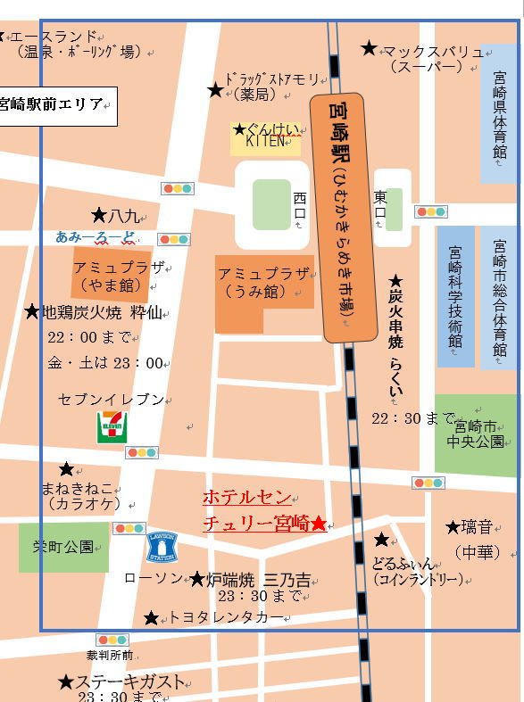 宮崎駅の東口のすぐ裏手にあります。当ホテルから歩いて5分ぐらいです。カウンター以外に半個室ぽい席が複数あるのでお子様連れでも行きやすいです。※宮崎駅の中にもこのお店のグループである炎の舞らくいもあります。お子様がいる場合は「炭火串焼らくい 宮崎駅東口店」の方が個人的におすすめです。私も子供が小さいときによく行っていました。宮崎名物がほぼ勢ぞろいの居酒屋さんです。予約をするほうがおすすめです。