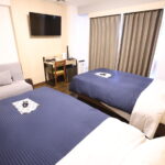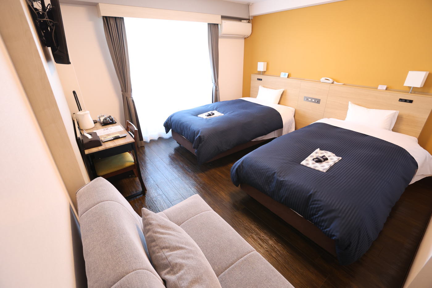 110㎝幅のシングルベッド×2台のツインルーム。ベッドを隙間なく並べてハリウッドツインにもできるので添寝のお子様も安心です。手狭になりますが備え付けソファーベット(※ベッド幅は88㎝)で合計ベッド3台のトリプル対応ができます。